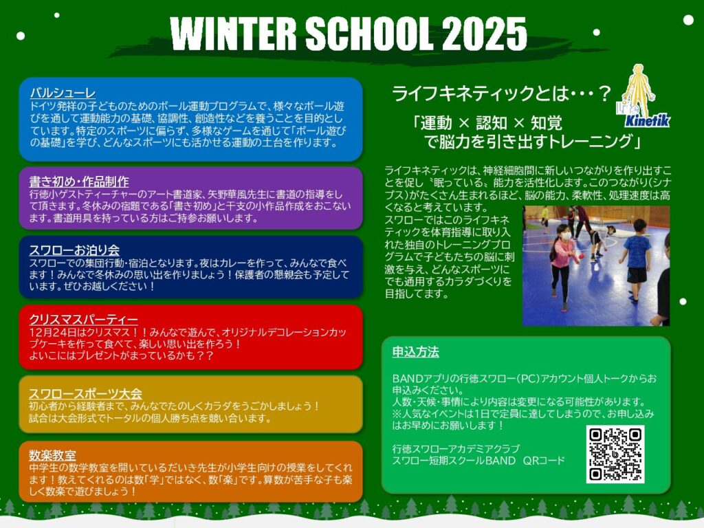 スワローのウインタースクールは12月24日~29日(今年は土日も行います)